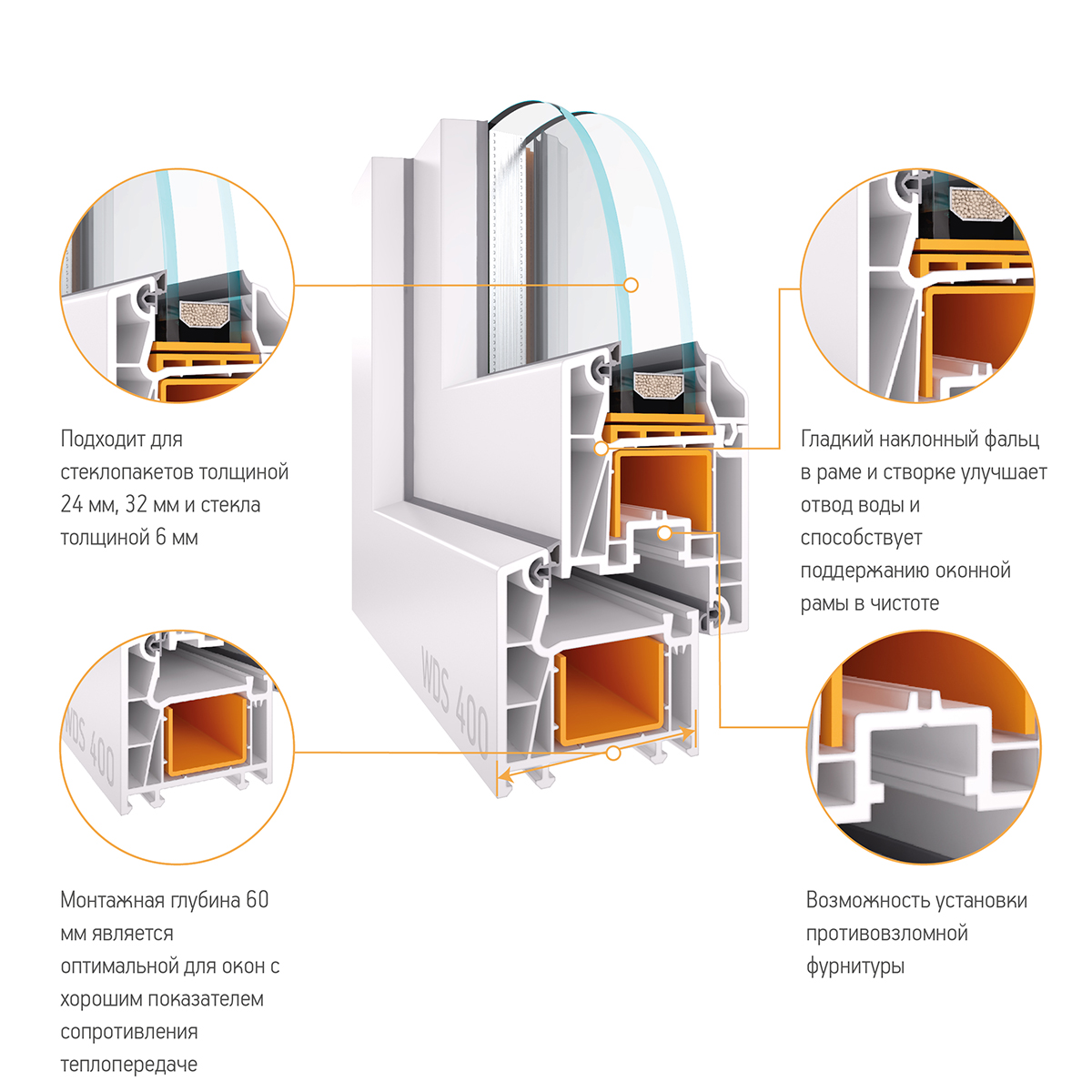 - Хорошие показатели энергосбережения и шумоизоляции, благодаря монтажной глубине 60 мм и четырем камерам внутри профиля